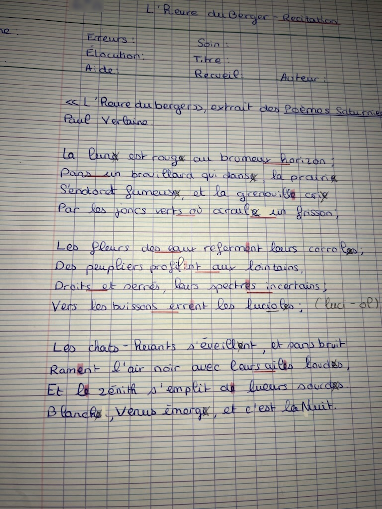 Quand on n'est pas sourd-muet, on apprend à réciter oralement, pas par écrit. Pas un texte défiguré accompagné de consignes écrites muettes. Comme si l'oralité était devenue secondaire. En cours de langue ! Comme si l'adulte en face des jeunes n'avait plus la capacité ou la volonté de communiquer directement. Comme si l'acte pédagogique se résumait à être là et à donner un travail à faire. Pas plus que cet écrit n'est une poésie, ce travail n'est un acte pédagogique.